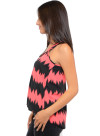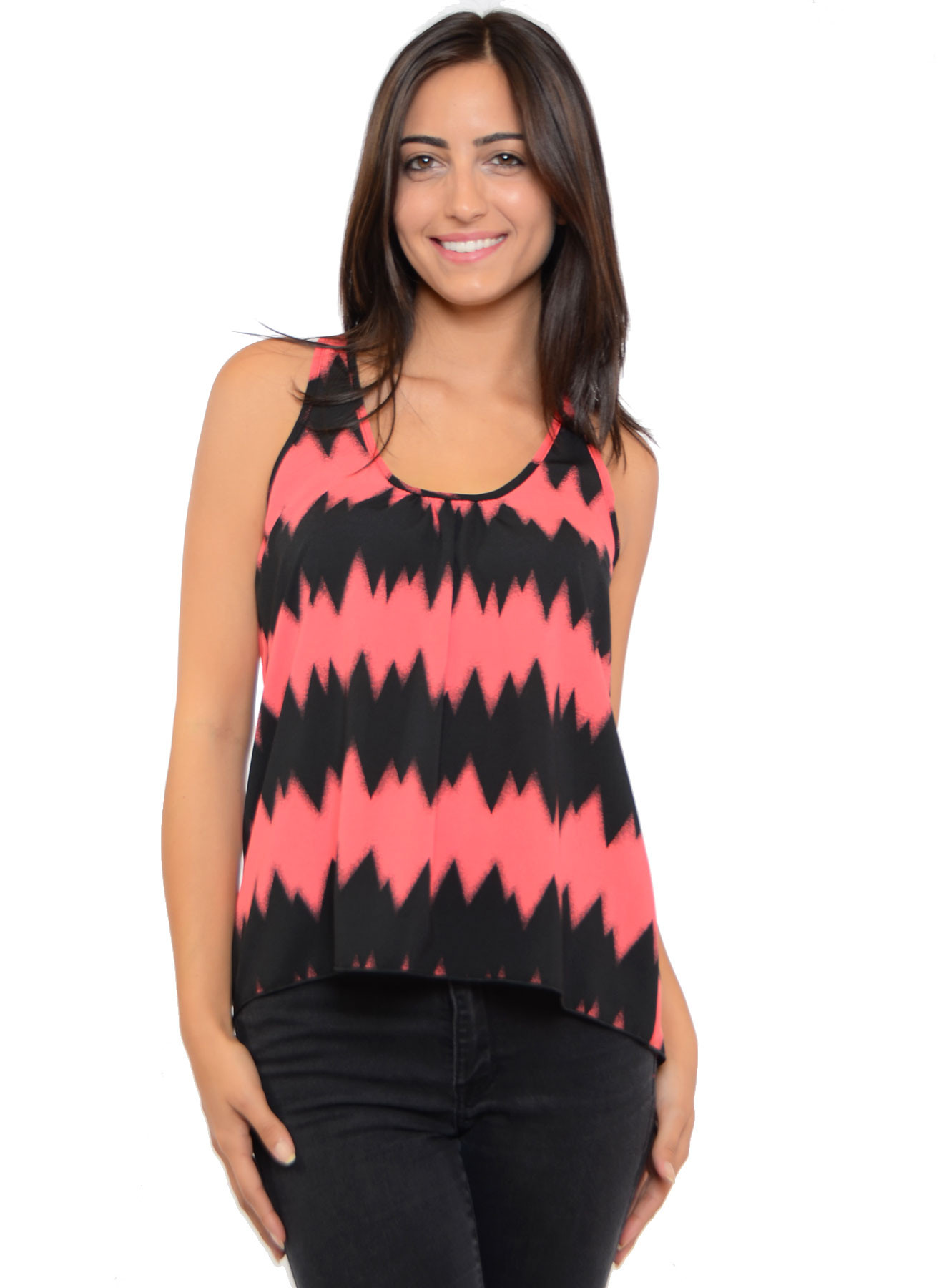 Description | Sleeveless, round-shirred neckline, racer back, partially hi-low chevron print top. BT-1486-BLACK/CORAL Size: S-M-L-XL Size Ratio: 1-2-2-1 Color: BLACK/CORAL Fabric: 100% Polyester Hand Wash Cold Water, Do Not Bleach Hang or Line Dry Made in USA |